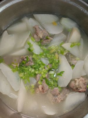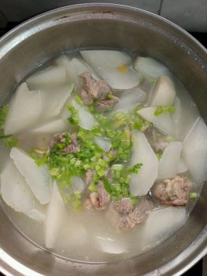 炖煮至萝卜变透明,排骨软烂就可以了(预计40分钟),中间多注意火候别煮干了哦~ 放盐调味后撒入芹菜碎关火闷几分钟,就可以开吃啦~