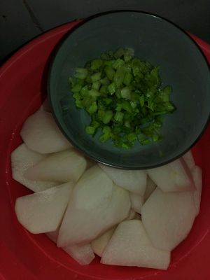 期间萝卜洗净去皮切块,小葱切末,香菜切小段备用。排骨炖够40分钟左右加入酱油1勺,再加萝卜块儿。