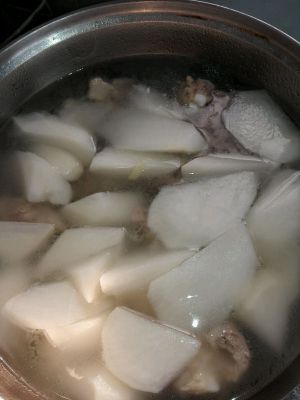 把煮排骨的水倒掉,在加水煮,煮到汤变奶色