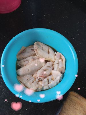 注意尽量买个头小一点儿的鸡翅,有些大鸡翅上有好多黄色的油,影响味道进入肉中。不要用鸡胸等肉多的部位去做,光用翅中是最好的。