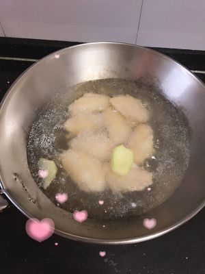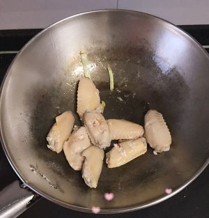 锅烧热 倒入一点点油 放入老姜 鸡翅将鸡翅两面煎一下
