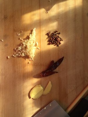 蒜切末,生姜切片(也可切末),干辣椒切丝,一小撮花椒待用