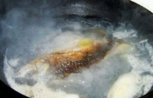 把煎好的鱼放到另一个煮好沸水的锅里,放入葱段,姜片
