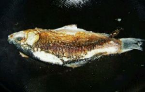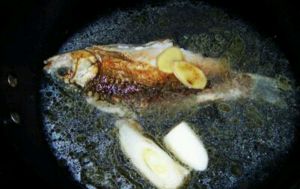 用热锅热油把鱼煎至金黄。为了防止鱼皮粘锅,可用姜片擦一下油锅