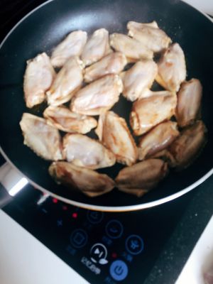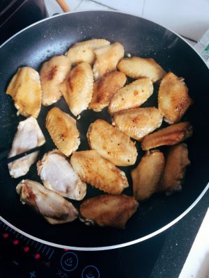 锅里倒几滴油 ,放鸡翅煎 鸡皮朝下,煎制金黄翻面