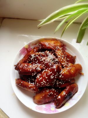 汁收的差不多就可以放入胡椒粉调味出锅,一般不用在另放盐,因为腌制的时候盐和老抽的咸度就差不多了。最后一步忘了拍图,直接上成品。鸡翅放入盘中,剩下的汁淋入鸡翅上撒上芝麻即可