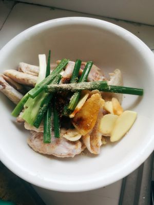 鸡翅放入淡盐水浸泡半小时,泡出杂质,洗净沥干,放入葱姜蒜(切大块,方便后面捞出)、盐、胡椒粉、花椒油(取代料酒,提色增香)腌制半小时