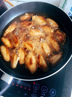 加一勺蚝油、酱油、老抽。待鸡翅均匀上色。