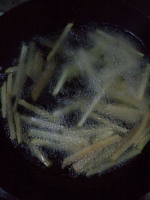 将油烧制七八成热的时候,将蒸好的薯条放入炸致金黄色即可。