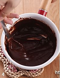 中小火加热至巧克力逐渐融化,这时会发现有些不均匀的颗粒状,没关系,继续熬。