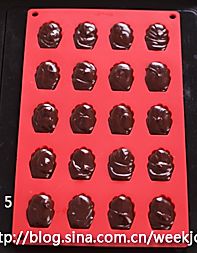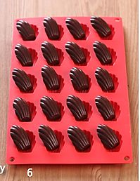 稍凉一会,装入裱花袋中,挤入模子里,若是稍硬不平,则放入烤箱100度稍微烤一会(巧克力口味不能用太高温度),看到表面变软变平一些立刻出炉。(烤并不是必需,只是让形状更贴合一些)。