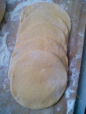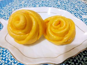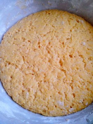南瓜切块蒸熟,和成南瓜泥,凉半温时加入酵母、面粉和成面团发酵,视温度季节不同时间所需也不同,发成所图蜂窝状。
