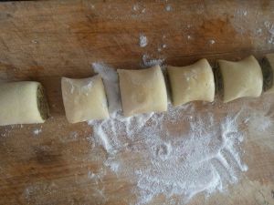 从一边卷起来,切成段。