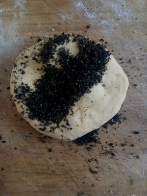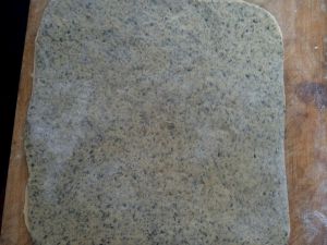 把南瓜泥和黑芝麻面团擀成面片。