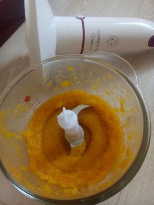 把蒸好的南瓜晾凉后放进搅拌杯内,用料理棒搅打成泥。