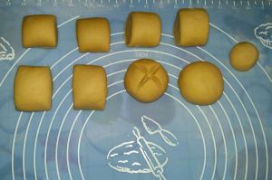 取南瓜面团,分成2克左右一个的小面团,每6个为一组。