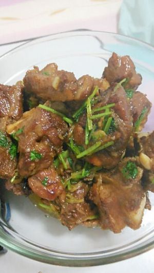 当汤汁还有一点的时候放入蒜末,香菜,然后开大火翻炒,直到汤汁收干,美味的红烧排骨那就大功告成啦