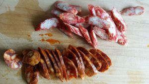 将排骨和香肠摆在米饭上,继续蒸8-10分钟。