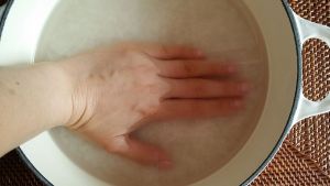 锅里冒起闻到米饭的香味后大约2-3分钟,打开锅盖子,在锅中间用筷子插4个孔,分别在孔里倒入少许植物油,然后在沿着锅边用小勺浇上植物油!油别太多,油多比较腻,如果不加油的话,锅巴则会糊掉!