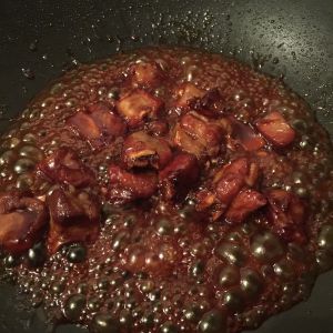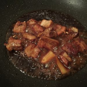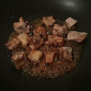 放入排骨、姜片,迅速翻炒,让排骨裹匀糖浆。