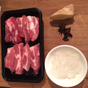 准备材料:猪排、姜等大料、冰糖。姜和八角茴香目的是去猪肉的腥味。
