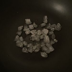 炒锅倒入适量食用油,不用等到油热倒入冰糖翻炒,炒至冰糖全部融化,锅底有泡泡冒出即可。