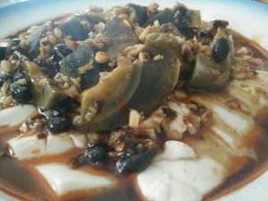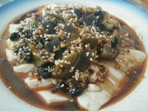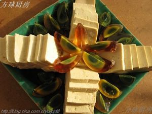 豆腐烧好后,切一切,放上皮蛋。摆盘不好见谅。
