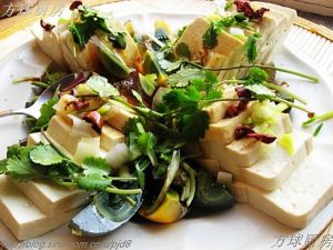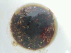 把盐和酱油还有少许醋倒到一个小碗里搅匀,浇到盘里,然后倒入少许辣椒油和香油,再洒上点葱花香菜就ok了