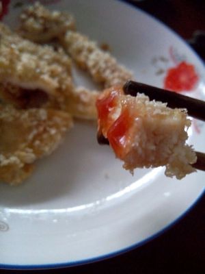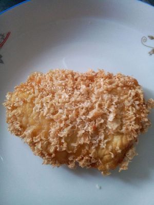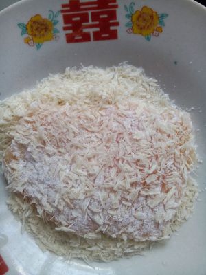 沾完鸡蛋液,就把它放到面包糠里,匀均地沾上面包糠