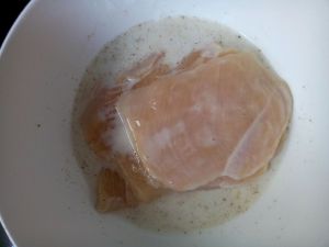 淀粉、椒盐,食盐再加点水,把鸡胸腌制几分钟。(本来想用胡椒,奈何家里没有,就用了椒盐。)