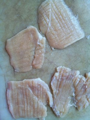 鸡胸片成四片,如果你的鸡胸不太厚三片也行。片好用刀背切切,防止油煎的时候缩小。