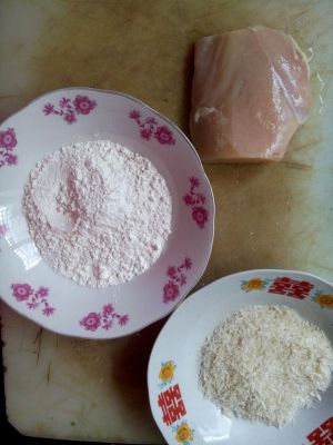 在锅中放油 先将鸡胸肉沾取蛋液 再裹面粉 再裹面包糠 放入锅内炸至金黄备用