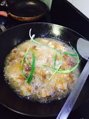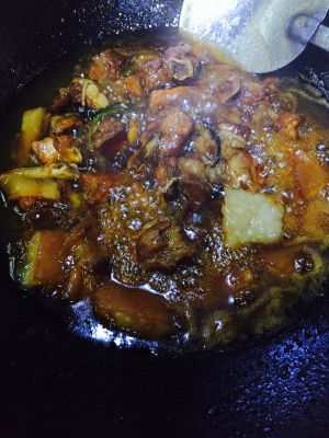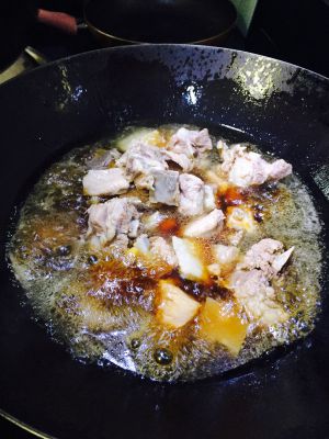 锅烧热倒油,油烧热放姜,放排骨爆到排骨有点变色,然后放进开始准备好的辅料在油里爆炒,再和排骨一起炒!另外加点老抽和糖、盐,都是少量!