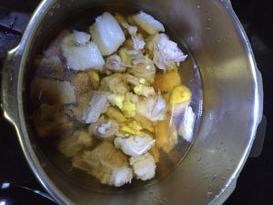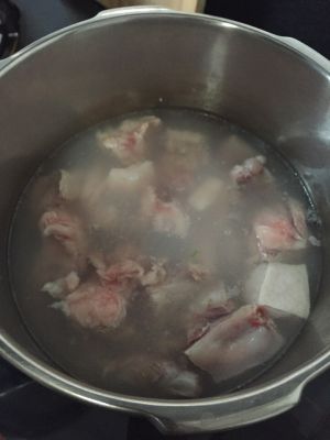 2:高压锅放排骨、五花肉,适量料酒、少量酱油、姜片、水多一点,盖锅煮熟。