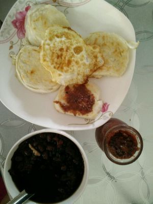 馒头外酥里嫩,在放个鸡蛋,馒头片来点自制李子酱,早餐完成
