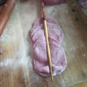 直接把面团擀开撒上准备好的面粉,三折叠起,继续擀成薄饼,以此类推直至把所有面粉都擀进面团中,就是所说的"戗面"。把准备好的面粉分5~7次擀入面团中,每次都要使面粉与面团充分融合在一起后再加下一次