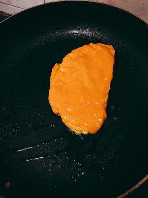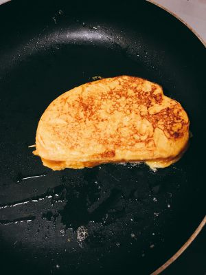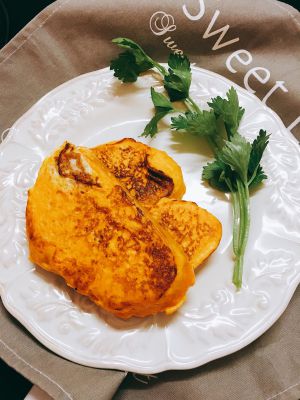馒头片两面沾上南瓜鸡蛋液,不粘锅放橄榄油,稍热放入馒头片,中火煎,盖上盖子让两侧受热好熟