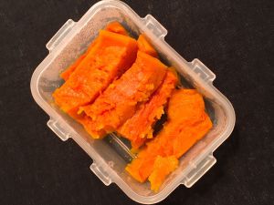南瓜切片蒸熟,加入白糖,趁热压成泥