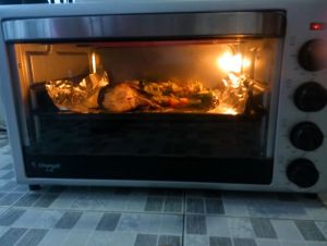 烤箱中层,上下火,200度,烤到熟。中间如果表面油少了,可以再浇些油上去。