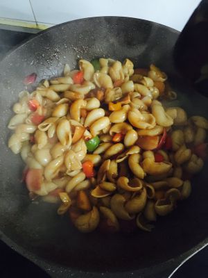 加入面食猫耳朵,酱油,盐,蚝油,味精快速翻炒爆香,淋入香油,出锅。
