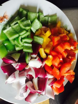 将洋葱、青椒切块,葱姜蒜切碎备用。