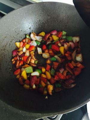 先加入葱姜蒜,花椒粉爆香,再加入洋葱、青椒大火快速翻炒片刻。
