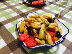 放入猫耳朵煸炒,最后放进木耳煸炒出锅