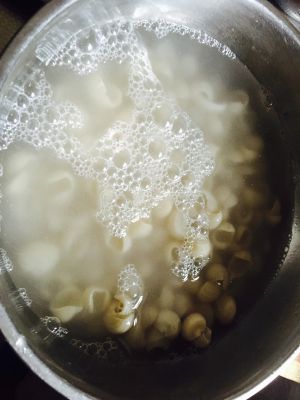 煮到飘起来了,变大了就行了,我用的是干的小火煮。可以稍微用凉水涮一下再炒也行,我喜欢吃粘粘的就没涮水。