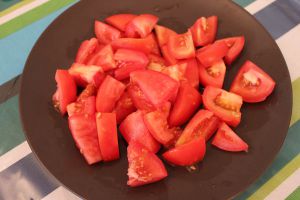 将番茄洗干净,如果有空把皮烫掉更好,没空可以直接切成块,要小一点哦