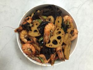 油八分熟的时候放入干辣椒和花椒煸炒!然后放入葱姜蒜继续煸炒!煸炒出香味即可!不要炒太久!辣椒容易苦!然后放入虾先进行煸炒,之后放入其他菜品!进行翻炒!炒至蔬菜熟后,放入鸡精少许、盐适量、酱油少许、醋少许!继续翻炒片刻!入味起锅!