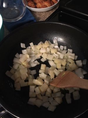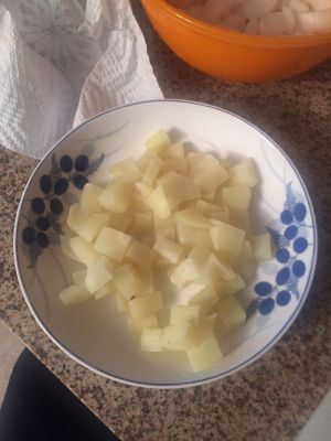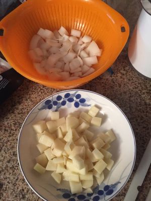 洋葱,土豆切丁,喜欢胡萝卜青椒的也一起切小块…