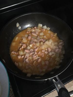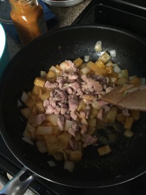 另起锅,放入洋葱爆香,待其边缘半透明下半熟的土豆翻炒,然后加入咖喱,我用的是泰式红咖喱酱,咖喱产品很多选择自己喜欢的口味便可