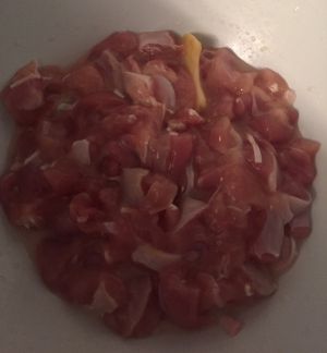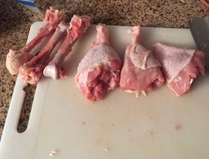 准备三只鸡腿…去骨…切成小块备用