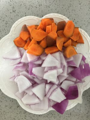 胡萝卜洗净用滚刀切成与鸡块同大,洋葱也洗净切成块。